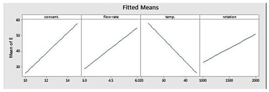 Figure 3 depicts the fitted means of modulus of elasticity as a function of concentration, flow rate, temperature, and rotation. Based on that figure, concentration, flow rate, and rotation had a positive correlation with elastic modulus, while temperature showed the opposite. This means that higher level settings of concentration, flow rate, and rotation will yield fibres with a higher elastic modulus. On the other hand, increasing temperature will decrease fibre elastic modulus. Figure 4 shows the interaction effect of concentration and temperature on modulus of elasticity. The effect of concentration on fibre elastic modulus depends on temperature. At the highest temperature, elastic modulus was relatively similar across all concentration levels. At the middle temperature range, increasing concentration improved the elastic modulus. This improvement was more pronounced when the system temperature was set at the lowest level. According to the graph, the highest modulus can be achieved when concentration is set at the highest level and at the minimum temperature.