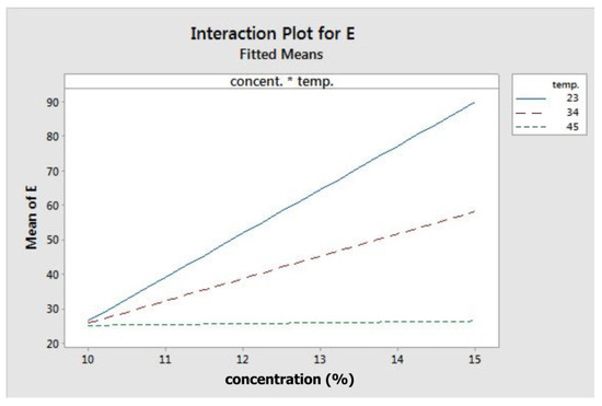 The plot of temperature versus concentration shows curvature, indicating that there is interaction between both factors. That is, the effect of either temperature or concentration is not always the same. At lower concentration, temperature doesn’t have an effect on fibre modulus, as opposed to a higher concentration setting. Conversely, concentration shows a clear effect on elastic modulus at lower temperatures. This graph also shows that the elastic modulus increases as the concentration rises and the temperature reduces simultaneously. Additionally, it suggests that the elastic modulus can be maximized at a concentration of 15% w/v and a temperature of 25 °C or below.