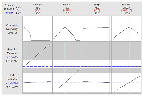 In this experiment, the design parameter for response optimization is set to obtain a minimum fibre diameter and a modulus of elasticity of 25 MPa. The goal for diameter is to minimize it. Since the optimizer procedure required boundary values to be set, a value of 120 nm was considered as a target and values above 2 µm were unacceptable. For elasticity, the goal was to obtain a value at or near 25 MPa, where values less than 14 MPa or greater than 36 MPa were unacceptable. These values are based on the properties of acetabular labrum that possessed a fibril diameter of 120 nm and a tensile modulus of 24.7 ± 10.8 MPa [43,44]. This optimization was run based on the regression model suggested by response surface analysis.