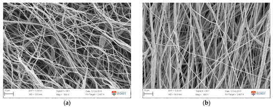 Regarding mechanical properties, the positive impact of solution concentration was also confirmed by several studies [26,35,39]. The higher modulus obtained was associated with the aligned polymer chain along the fibre axis [26]. Polymer solutions with lower concentration might lack effective chain entanglements, which are required for the extension of main chain segments without slippage and molecular relaxation effects [55]. Furthermore, mechanical properties of polymer and electrospun polymer fibres were related to chain ordering or crystallinity [56,57,58,59].