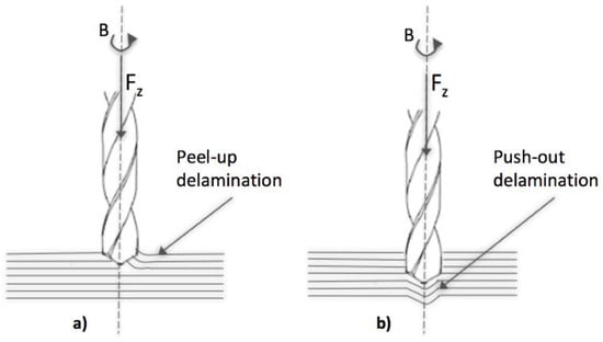(a) Peel-up and (b) push-out delamination induced by drilling of fibre reinforced plastic (FRP) laminates.