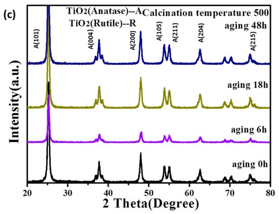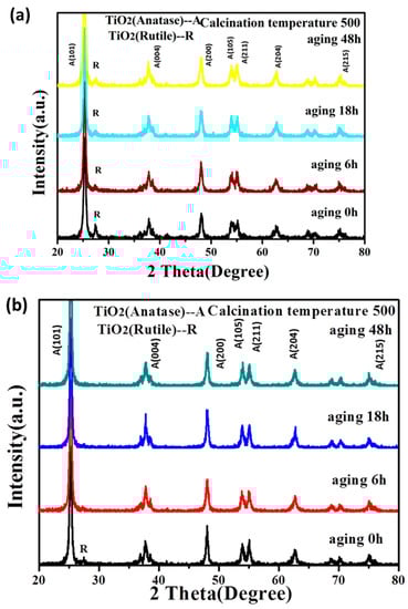 When the hydrolysis control agent was triethanolamine, rutile TiO2 powder formed together with anatase TiO2. Compared with others, the intensity of the characteristic peaks of the rutile TiO2 was the largest when the aging time was 0 h, corresponding to the highest amount of rutile TiO2. The amount of rutile phase decreased but still existed as the aging time was between 6 h and 48 h. Rutile phase TiO2 only existed in the product when using acetylacetone as the hydrolysis control agent and the aging time is 0 h. When the hydrolysis control agent was the mixture of acetic acid and hydrochloric acid, the formed TiO2 powder was in a single anatase type and did not change as the aging time increased.