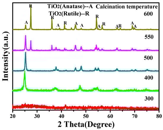 Figure 2 shows the XRD patterns of the samples obtained after TiO2 sol being calcined at different temperatures. When the calcination temperature was 300 °C, there was no obvious crystal formation, except for the broad scattering peak when 2θ was 25°. As the temperature increased to 400–500 °C, the diffraction peak of anatase TiO2 emerged with a slight amount of rutile TiO2. The higher the temperature, the sharper the peak shape. When the temperature increased to 550 °C, the final product was a mixture of anatase TiO2 and rutile TiO2. The diffraction peak intensity of rutile TiO2 increased further when the temperature reached 600 °C, which is in accordance with the literature [32]. Meanwhile, the peak intensity of anatase TiO2 decreased to a relatively low level. Since anatase TiO2 has much better photocatalytic properties than rutile TiO2, the proper temperature is 500 °C.