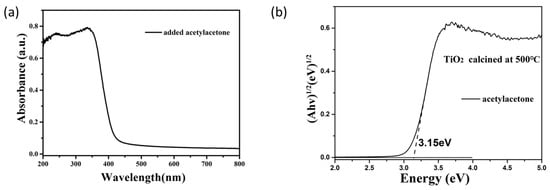 Figure 4a displays the UV-visible diffuse reflectance spectrum in the wavelength range of 200–800 nm for TiO2 obtained by the calcination of the TiO2 sol. Its band-gap value was calculated using the UV-visible absorption spectrum according to the Kubelka–Munk equation [33]:
