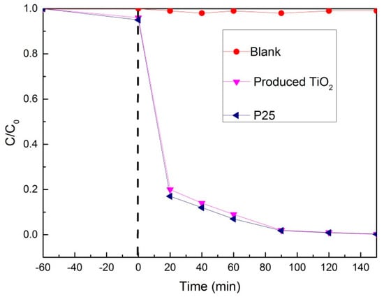From Figure 5, it can be seen clearly that the produced TiO2 had an obvious photocatalytic effect. Nearly 90% of the methylene blue was degraded at 40 min and almost all of it was degraded in 90 min. The produced TiO2 had similar photocatalytic degradation ability compared with P25. The excellent photocatalytic degradation ability of the produced TiO2 will be a great help to the self-cleaning performance of the TiO2 film.
