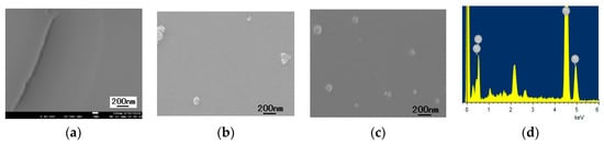 SEM images of the TiO2 thin film formed using acetylacetone as the hydrolysis control agent (a) aging time 0 h; (b) aging time 6 h; (c) aging time 48 h; (d) The EDS of the thin films.