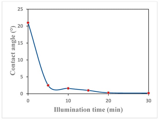 The effect of the illumination time to the hydrophilic properties of the film was also investigated. Figure 7 shows water contact angle changes of TiO2 film with illumination time. Before illumination, the contact angle of TiO2 film was 21°, while after 5 min illumination, the contact angle was reduced to less than 5°, which showed super-hydrophilic properties. The contact angle of TiO2 film reduced continuously with illumination time and reached almost 0° when the illumination time was 20 min, which meant complete wetting and super hydrophilicity were realized by then. The above-mentioned light-induced super-hydrophilicity of the TiO2 film is an important factor in its self-cleaning ability.