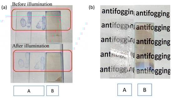 The self-cleaning function and antifogging property of TiO2 film were also tested (Figure 8). Methylene blue was used as a kind of organic pollutant to coat the surface of glass slides with or without TiO2 film. Compared with the glass slide itself, the TiO2 film before illumination had a relatively smaller water contact angle, therefore, the methylene blue coated on TiO2 film had a bigger coated area and the coating was more even. After illumination, the glass slides were washed slowly with water. From Figure 8a, it can be seen that the pollutant was still on the glass slides without TiO2 film coating with an obvious profile, while the glass slides with TiO2 film regained their cleanness in the center, which meant the TiO2 film had the self-cleaning function. The antifogging property of TiO2 film was also tested (Figure 8b). After illumination, the glass slides were sprayed on the surface. A large number of water droplets emerged on the surfaces of glass slides without TiO2 film, leading to poor vision of the background image. Instead, the glass slides with TiO2 film were quite clean, which showed the extraordinary antifogging properties as well as the light-induced hydrophilicity of the produced TiO2 film.
