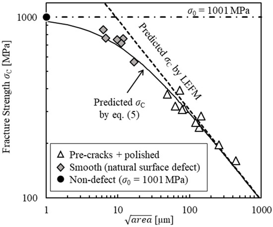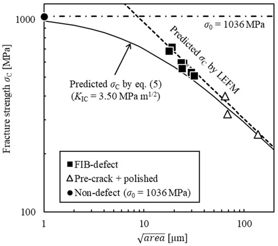 The σC of the sample material was predicted substituting KIC = 3.50 MPa·m1/2 and σ0 = 1036 MPa into Equation (5). Figure 7 shows the predicted σC values and the bending test results. For the pre-crack + polished specimens, the predicted σC values matched the experimental results. Thus, the usefulness of this equation was confirmed. The errors between the experimental and predicted results were generally within ±15%. It is thought that the prediction errors are mainly caused by the approximation errors of Kmax by Equation (3). For the FIB-defect specimens, the experimental σC are between the predicted σC based on LEFM and Equation (5). The predicted values of σC based on LEFM and Equation (5) give the upper and lower limit, respectively. Similar tendency that Equation (5) gives lower σC was observed in the results shown in Figure 1. The results indicate that a FIB-defect can be used as a small initial crack for fracture strength evaluation of ceramics. It was found that the evaluation equation was useful for evaluating the fracture strengths of ceramics containing micro surface defects introduced by FIB.