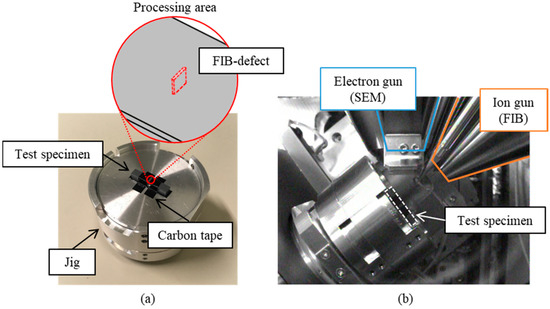 Photographs of the FIB process: (a) fixing method of test specimen; (b) inside of device.