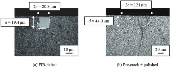 An FIB defect was introduced at the center of each smooth specimen by using a multi beam SEM-FIB system JIB-4501 (by JEOL Ltd., Tokyo, Japan). These specimens are called the “FIB-defect” specimens. Figure 2 shows the detail of the FIB technique process. A test specimen was fixed on a jig with carbon tape. The FIB defect was processed while monitoring the processing state using the SEM. Figure 3a schematically shows the shape of an FIB defect. The surface lengths (2c) ranged from 20 to 60 µm and the depths (d) ranged from 19 to 24 µm. The conditions of the FIB technique are presented in Table 1. The area of a defect was evaluated based on the fracture surface observation.