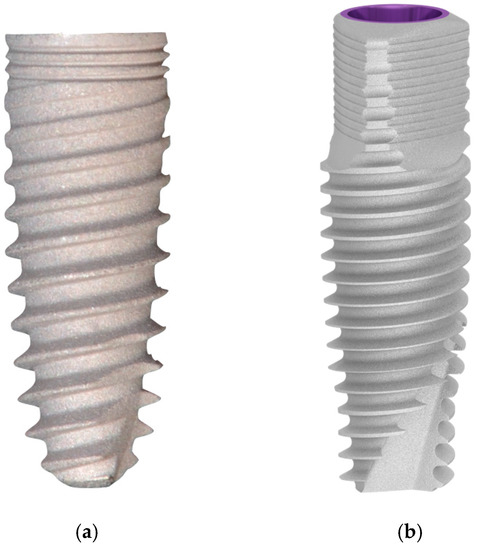 Implant designs compared in the study: C1® implant (a) and V3® implant (b).