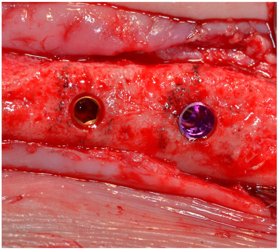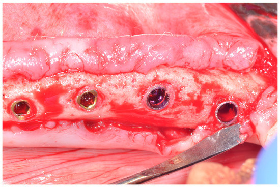 Six female, one-year-old, American Foxhound dogs, with a weight of approximately 14–15 kg were used in the study. Animal examination before study concluded that the animals were in good health, with no disease. All the animals presented good oral health, with no obvious pathology or lesions. The implants were inserted into the hemi-mandibles of the dogs at P2, P3, P4 and M1 locations, placing four implants per hemi-mandible (Figure 2). The distribution of the two groups of implants, and their positions in the mandible were decided using a randomization generator (www.randomization.com).