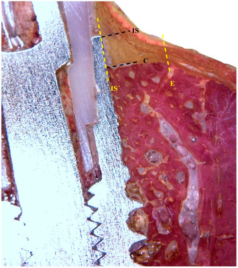 Linear measurements to assess peri-implant bone remodeling and peri-implant soft tissue remodeling. IS: implant shoulder; C: first bone-to-implant contact; IS´: implant surface; E: the most external portion of the epithelium.