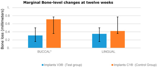 Marginal bone-level changes between baseline and 12-week study times. Marginal bone loss (mean ± SD); * indicates significant differences (p < 0.05).