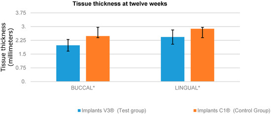 Tissue thickness was measured from the top of the implant shoulder (line IS´) to the most external portion of the tissue (line E). Mean tissue thickness in the test group was 1.98 ± 0.17 mm on the buccal aspect and 2.43 ± 0.93 mm on the lingual, and in the control group it was 2.48 ± 0.61 mm on the buccal aspect and 2.88 ± 0.14 mm on the lingual (Table 3). Statistically significant differences between the groups were found at 12 weeks on both the buccal (p = 0.0043) and lingual (p = 0.0029) aspects. The bar graphs in Figure 5 and Figure 6 represent the measurements obtained for crestal bone and tissue thickness, respectively.