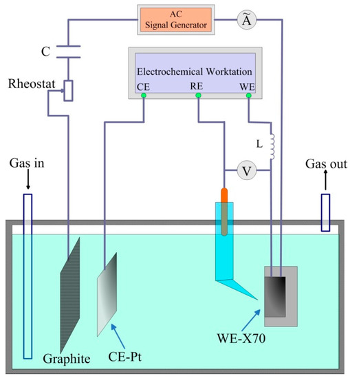 Figure 2 shows the schematic diagram of the experimental set-up for studies of AC corrosion under cathodic protection. The electric circuit was specially designed to supply and measure AC and DC signals independently [6]. Ormellese et al. [21] and Büchler et al. [23,24] have used this circuit to investigate the alternating current corrosion of cathodically protected pipelines. In this work, an AT1645-3 function generator (ATTEN, Shenzhen, China) which was connected to the ground through its power supply was used to provide the AC signal. The sinusoidal AC signal with a frequency of 50 Hz was applied between the working electrode and a graphite electrode. A rheostat, with a range of 0–9999 Ω, was used to adjust the AC current to the present value. Within the AC mesh, an electrolytic capacitor (50 V, 470 μF) in series was used to prevent DC circulation. As described by Goidanich et al. [6], by using two electrolytic 1000 μF capacitors (total capacity of 500 μF and a capacitive reactance of about 6 Ω), the efficiency of the DC filter was 100%, i.e., no DC flowed in the AC mesh. Within the DC mesh, DC current was supplied by an electrochemical workstation and a 4H inductance with a series resistance of 76 Ω was introduced to avoid the interference of the AC signal to the electrochemical workstation. Despite the inductance, a small part of the AC flowed in the DC mesh, which is negligible for the tests planned. The root-mean-square value of the AC current was measured with a clamp meter. The experimental details were illustrated separately in the following sections.