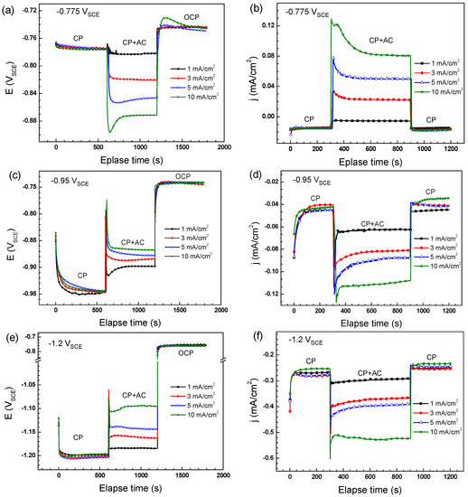 Theoretically, the DC potential gradually stabilized at open circuit potential when there are no external current sources. With the application of CP, new steady state of DC potential lower than the open circuit potential, which is called cathodic polarization, is reached because of the constant input of excess electrons. With the superimposition of AC, the steel is anodically and cathodcially polarized periodically. Under a weak cathodic protection potential of −0.775 VSCE, the cathodic polarization is enhanced by AC and more electrons are provided by external current sources, which causes the negative shift of DC potential in the CP + AC region (Figure 4a). When the CP potential is maintained at −0.95 VSCE or −1.2 VSCE, far more electrons are provided than that of −0.775 VSCE, resulting in the large deviation of the electrode from natural equilibrium state of OCP. In this case, the electrode has strong tendency to come back to the equilibrium state and only a slight disturbance of AC can cause the positive shift of DC potential (Figure 4c,e).