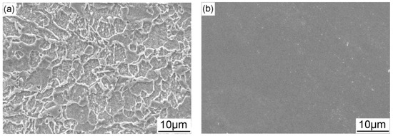 When there is no AC interference, no corrosion is detected under the application of CP (Figure 5). While when AC current is superimposed, the steel is corroded, even though it is cathodically protected (Figure 6). In the initial period of immersion under AC interference, the surface of the steel shows a metallurgic microstructure-like morphology. It reveals that α ferrite grains are prone to dissolve, while the carbides and the grain boundaries are away from attacking, attributing to the micro-galvanic effect between different phases in the steel [30]. Atrens et al. [31] found that grain boundaries of X70 steel had higher carbon concentration than ferrite grains. Liu et al. [32] characterized the local electrochemical activity of grains and grain boundaries of X70 steel and found that the grains were anodic relative to the grain boundaries. Tsuyoshi [33] measured the corrosion potential of iron and various carbides in different electrolytes and reported that all the tested carbides including cementite presented nobler corrosion potential than iron. In conclusion, carbon-rich structures of X70 steel act as cathode in the process of corrosion in the near-neutral pH solution, resulting in the corrosion morphology similar with the microstructure.