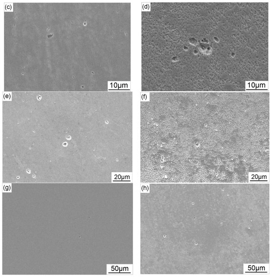 Figure 7 shows the corrosion morphologies of X70 steel immersed in the NS4 solution for 2 h after removing the corrosion products. Figure 7a,b shows that no apparent localized corrosion occurs with the interference of 3 and 10 mA/cm2 AC current at OCP. Under −0.775 VSCE CP, corrosion pits with the average diameter of 0.75 μm are formed on the specimen when the AC current of 3 mA/cm2 is applied (Figure 7c). As the AC current density increases to 10 mA/cm2, the diameter of corrosion pits becomes bigger (2.1 μm in average), as shown in Figure 7d. Figure 7e,f shows the corrosion morphologies of X70 steel under the combined effect of −0.95 VSCE CP and AC interference for 2 h after removing the corrosion products. Under this CP potential, bigger corrosion pits (1.6 μm in average) are initiated than that formed under −0.775 VSCE when 3 mA/cm2 AC current is applied to the specimen. As the AC current density is increased to 10 mA/cm2, severe localized corrosion occurs and some pits with the average diameter of 0.8 μm distribute in isolation. Under the CP potential of −1.2 VSCE and AC current of 3 mA/cm2, pit density is much lower than that formed under −0.95 VSCE CP and some metastable pits with low diameters are generated, as shown in Figure 7g. The pit diameter increases to about 0.6 μm when the AC current of 10 mA/cm2 is imposed (Figure 7h).