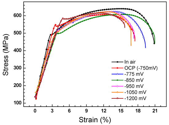 Stress–strain curves of the X70 steel in air and in the NS4 solution under OCP and different CP potentials without AC interference.