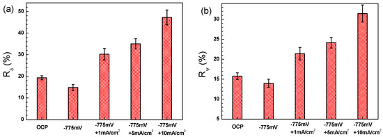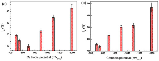 It has been reported that the process occurring during anodic half-cycle of the AC signal is not completely reversed during the cathodic half-cycle [7], meaning that a larger anodic current density than the cathodic current density is induced by AC when there is no CP. When the CP potential is −0.775 VSCE, the AC interference has similar effect with that of OCP. Anodic dissolution reaction rate is promoted, resulting in the increase of DC current from −15 to −6 μA/cm2 when 1 mA/cm2 iAC is superimposed to the electrode (Figure 4b). When the iAC is 3 mA/cm2 or higher, the anodic reaction is accelerated more heavily. As a result, the current densities become anodic in CP + AC region. With the application of −0.95 VSCE or −1.2 VSCE CP, the electrode has the tendency to come back to the equilibrium state of OCP when there is another external disturbance. Thus, more electrons are needed to maintain the cathodic polarization potential of the electrode with the disturbance of AC. More electrons mean higher cathodic current density. Therefore, DC current density is cathodic and the cathodic current density increases with the application of AC, as shown in Figure 4d,f.