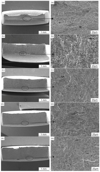 Figure 13 shows the SEM views of the fracture surface morphology after SSRT tests when the X70 steel is under combined CP and AC interference. When AC current is superimposed, large brittle fracture zones can be observed. The micro-morphology of the fracture surface shows apparent brittle characteristics when the AC current is 5 mA/cm2 (Figure 13c,d) and 10 mA/cm2 (Figure 13e,f), which also indicates that AC decreases the resistance of X70 steel to SCC when it is under cathodic protection.