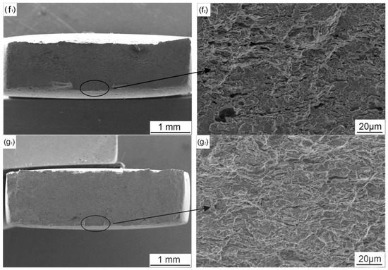 SEM images of the fracture surface of X70 steel: in air (a); and in NS4 solution under different CP potentials: (b) OCP; (c) −0.775 VSCE; (d) −0.85 VSCE; (e) −0.95 VSCE; (f) −1.05 VSCE; and (g) −1.2 VSCE.