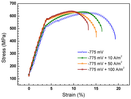 Stress–strain curves of the X70 steel in NS4 solution under −0.775 VSCE CP with application of different AC current densities.
