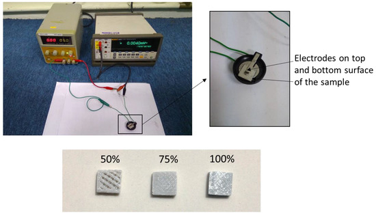 Tensile testing was carried out on the printed samples according to ASTM D638 using Universal Instron machine (Instron, Norwood, MA, USA), which was set at a crosshead speed of 5 mm/min [20]. The average result was taken of five samples for each formulation. Dynamic Mechanical Analysis (DMA) measurements were performed in Seiko DMS 210 (Seiko Instruments Inc., Chiba, Japan) in tension mode at 1 Hz. The testing was carried out from 30 to 150 °C at a rate of 5 °C/min under constant nitrogen flow. Dynamic storage modulus, loss modulus, and damping factor were obtained from the results. Electrical conductivity measurement was carried out using a two-probe method with a Keithley’s source measure unit (Model SMU 236) (Tektronix, Beaverton, OR, USA) at room temperature, as shown in Figure 3. Samples were cut into dimensions of 1 cm (W) × 1 cm (L) × 0.4 cm (H), and polished on both sides into a thickness/height of 2 mm.
