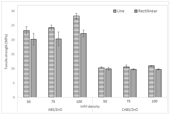 Figure 4 shows the effect of infill density and printing pattern on the tensile strength of the composites. For both line and rectilinear samples, the tensile strength increased gradually as the infill density increased. The tensile strength for ABS/ZnO line samples were 23.3, 24.19, and 28.24 MPa for the infill density of 50%, 75%, and 100%, respectively. For CABS/ZnO line samples, the tensile strength improved 6.3% to 10.31 MPa when infill density changed from 50% to 100%. The tensile strength for ABS/ZnO rectilinear samples were 20.21, 20.32, and 22.19 MPa for the infill density of 50%, 75%, and 100%. For CABS/ZnO rectilinear samples, only minor improvement was observed (~2%) when infill density changed from 50% to 100%. Maximum tensile strength of 28.24 MPa was observed for ABS/ZnO sample printed with the combination of line pattern and 100% infill density. At 100% infill density, there was no gap between printed lines, and each layer started to form, bonding with the next layer. The ability of printed layers to deform and absorb the stress before a break in the bonds between different printed layers increased, and thus, the tensile strength of the sample increased [17,18]. When the infill density decreased, the gap between printed strands became larger, and the bonding between layers became weaker, therefore tensile strength decreased [16]. The tensile strength of the ABS parts was found in the range of 20–28 MPa. Based on the study of Dawoud et al., the tensile strength of 3D printed ABS samples was in the range of 65–72% of injection molded parts. They reported the injection molded part with tensile strength of 33–38 MPa. This result was in good agreement with the findings reported by Dawoud et al. [15]. However, the tensile strength of CABS composites was much lower than that of ABS composites and revealed the poor adhesion between carbon black, ABS, and ZnO.