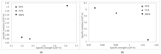 Figure 6 shows the effect of infill density on specific strength and modulus of the samples. For ABS samples, samples with 100% infill density appeared to have higher specific modulus and strength values than those with 50 and 75% infill density. However, the trend was opposite for CABS samples. Samples printed with 50% infill density were observed to have higher specific modulus and strength values, followed by those printed with 75 and 100% infill density. Comparing between ABS and CABS, the specific strength and modulus value of ABS composite was higher, and indicated that it has light weight with high modulus and strength.