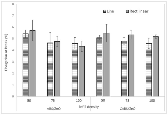 Figure 7 shows the effect of infill density and printing pattern on the elongation at break of the composite samples. The elongation at break for ABS/ZnO line samples were 5.43%, 4.64%, and 4.6% for the infill density of 50%, 75%, and 100% respectively. For CABS/ZnO line samples, the elongation at break reduced from 5.08% to 4.6% when infill density increased from 50% to 100%. The elongation at break for ABS/ZnO rectilinear samples were 5.72%, 4.76%, and 4.34% for the infill density of 50%, 75%, and 100% respectively. For CABS/ZnO rectilinear samples, the elongation at break reduced from 5.48 to 5.18 when infill density increased from 50% to 100%. The increase of infill density improved the stiffness of the samples due to better bonding between printed layers, and thus, reduced the elongation at break of the composites [24]. Rectilinear samples which were more flexible elongated more than line samples.