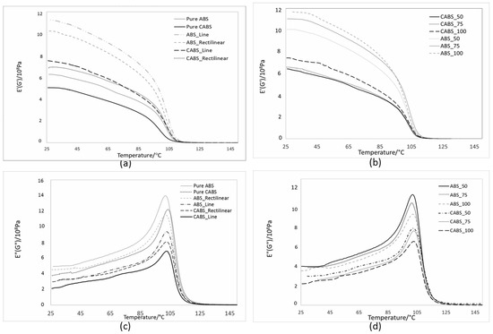 Figure 8a,b show the dynamic storage modulus, E’, of the composites at different printing pattern and infill density, respectively. E’ measures the stiffness and elasticity of a material [24,25]. The E’ curve underwent the characteristic steep decrease from 30 °C to 100 °C, due to the increase in the molecular mobility of the polymer chains when temperature increased [26,27]. The E’ values of composites are higher than that of pure ABS and CABS at the same temperature, owing to the stiffening effect resulting from ZnO filler addition. By adding in fillers that having good interfacial adhesion with matrix, the storage modulus will be improved [28]. However, ineffective stress transfer between fillers and matrix occurred when the spacing between filament strands was greater. The reduction of the stiffening effect of fillers resulted in lower E’ value. When the infill density increased, a close raster and deposited fibers were generated, which led to a denser structure and improvement in E’ of the printed parts [29]. Rectilinear samples showed a slightly lower storage modulus value at all temperatures below glass transition temperature, Tg, compared to line samples, due to less stiff structure.