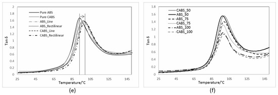 Figure 8c,d show the loss modulus, E”, of composites at different printing pattern and infill density, respectively. Loss modulus is the ability of the material to lose energy, which is inversely proportional to storage modulus [27]. More energy is dissipated due to stiffness reduction, and therefore, loss modulus is maximum for samples which are less stiff. Therefore, comparing between line and rectilinear pattern, loss modulus was greater for rectilinear samples which were less stiff. Loss modulus peak, as well as the Tan δ peak, were found to be shifted towards higher temperatures for both ABS and CABS composites as compared to pure ABS and CABS, which indicated higher thermal stability of composites as a result of filler addition. After the maximum peak, loss modulus decreased due to the increase of polymer chain mobility. Both the peak of loss modulus and Tan δ can be used to determine the glass transition (Tg) of the material, and there would be variation on both values. In our study, Tan δ was used to determine the Tg. The Tg of pure ABS and CABS was in the range of 94–95 °C, and increased to 101–103 °C when filler was added in. No significant impact was observed on the Tg for printing pattern and infill density change. Increasing Tan δ means the material has more energy dissipation potential, whereas decreasing Tan δ means when load is applied, the material has more potential to store the load, rather than dissipating it [28,29]. Results in Figure 8e showed Tan δ decreased with infill density. In Figure 8f, rectilinear samples showed comparable damping with line samples.