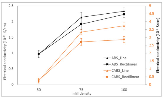 Figure 9 shows the electrical conductivity of ABS and CABS composites with different infill density and printing pattern, respectively. Pure ABS has the electrical conductivity of 9.16 × 10−12 S/cm, whereas pure CABS has higher electrical conductivity, which is 1.312 × 10−7 S/cm. This is due to the carbon black content in CABS, which has electrical conductivity as high as 5.58 S/cm. We found that higher infill density led to higher electrical conductivity. The conductivity of ABS line sample was 9.64 × 10−12 S/cm, and increased to 2.14 × 10−11 S/cm and 2.33 × 10−11 S/cm, with increasing infill density from 50% to 100%. The conductivity of ABS rectilinear sample was 9.71 × 10−12 S/cm at 50% infill density and improved to 2.23 × 10−11 S/cm at 100% infill density.