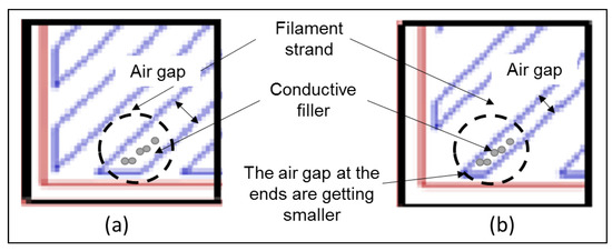 For CABS, the conductivity of line sample was 2.32 × 10−7 S/cm, and increased to 3.74 × 10−6 S/cm with the increase of infill density from 50% to 100%. For rectilinear sample, conductivity was 2.64 × 10−7 S/cm at 50% infill density, and increased to 2.86 × 10−6 S/cm at 100% infill density. In general, electrical conductivity increased with infill density due to the formation of more conductive pathways between ZnO fillers and carbon black within the filament strands when the filaments were deposited closer together. Line samples were reported with higher electrical conductivity compared to rectilinear samples. At 50% infill density, the conductivity difference between rectilinear and line pattern was insignificant. However, there was noticeable difference at 75% infill density, possibly due to the air gap difference between two different patterns. Figure 10 shows the air gap between rectilinear and line pattern. The air gap of line pattern at both connecting ends are getting smaller when it approached the wall, and increased the possibility of the conductive fillers within the air gap to form conductive path across the materials. Therefore, a huge step-up was observed when density changed from 50% to 75%. When density changed to 100%, only a minor increase in conductivity was observed, which indicated optimum conductivity has reached at 75% infill density. For CABS, the difference of conductivity at 100% infill density between line and rectilinear was more significant. That could be due to higher porosity within rectilinear CABS samples. Printing pattern which exhibited less consistent extruder motion, which was rectilinear pattern, led to less consistent adhesion between layers; therefore, more voids/pores formed within rectilinear samples. Besides that, the formation of voids/pores in CABS samples was also contributed to by the formation of agglomerations, due to poor adhesion between fillers and matrix.