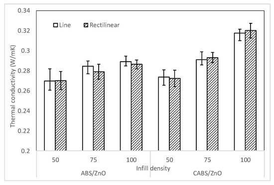 Figure 11 shows the thermal conductivity of ABS and CABS composites with different infill density and printing pattern. Thermal conductivity of CABS/ZnO was found higher than that of ABS/ZnO, due to the presence of intrinsically high thermal conductivity carbon black [30]. The thermal conductivity of ABS line and rectilinear samples were 0.2697 and 0.2701 W·m−1·K−1. The conductivity values increased 7% and 5.6% to 0.2892 and 0.2863 W·m−1·K−1, respectively with increasing infill density from 50% to 100%. Similar trend was observed for CABS composites. The conductivity of line and rectilinear sample increased 13.8% and 15% to 0.3174 and 0.32 W·m−1·K−1 at 100% infill density. The thermal conductivity was observed to be improved with infill density, due to better heat transfer when the air gap between filament strands was getting smaller. The thermal conductivity values for both line and rectilinear samples were comparable, indicated the printing pattern has no impact on the thermal conductivity of the parts.