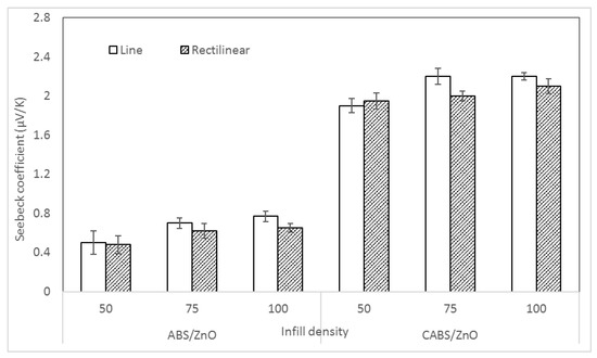 Seebeck coefficient of ABS and CABS composites with different infill density and printing pattern is illustrated in Figure 12. There was 35% and 26% of improvement when infill density increased from 50% to 100% for ABS line and rectilinear samples, respectively. For CABS line and rectilinear sample, the Seebeck coefficient increased 43% and 24% to 2.2 and 2.1 μV/K. The increase of Seebeck coefficient may be attributed to the larger number of layer interfaces between polymer matrix and fillers, which increased the carrier mobility, and thus, improved the Seebeck coefficient [31,32]. Similar to the electrical conductivity, line samples were reported with higher Seebeck coefficient than the rectilinear samples.