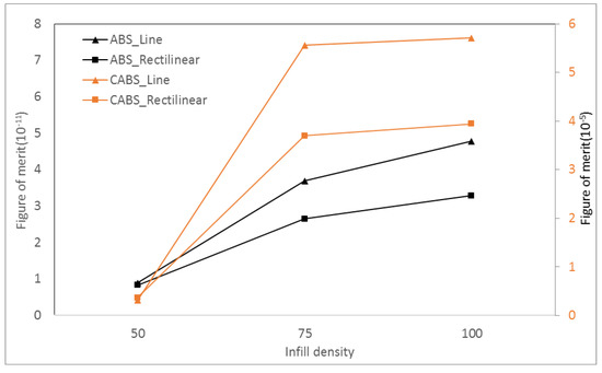 Figure of merit of ABS and CABS composites with different infill density and printing pattern.