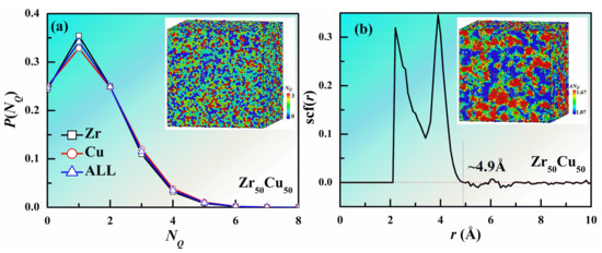 Firstly, we present the quantitative and spatial distribution of the number of QNAs (NQ) in Zr50Cu50 MG at 300 K in Figure 1. The quantitative distributions of NQ around Cu and Zr follow a similar behavior as shown in Figure 1a. However, the fraction of Cu atoms with small NQ is slightly smaller than that of Zr, and the situation is opposite for the atoms with large NQ. This indicates that the local packing of Cu is a little looser than that of Zr. Because of inherent limitations of MD method, the time scale in MD simulation is much shorter than experimental time scale. The local order of MGs can be significantly different with different cooling rates. The effects of different strain rates are beyond the scope of the present study, and hence we focus our discussions below on the same cooling rate. We note that the fraction shows a peak at NQ ~ 1 and only about 25% of the atoms have no QNA, suggesting that most of the atoms are not closely packed in the MG. Figure 1a also shows a configuration with atoms colored by their NQ. It can be clearly seen that the atoms with more QNAs intend to aggregate together, indicating the spatial heterogeneities of QNA. To directly reflect the spatial heterogeneities of QNA, we investigated the space correlation function for NQ which is defined as