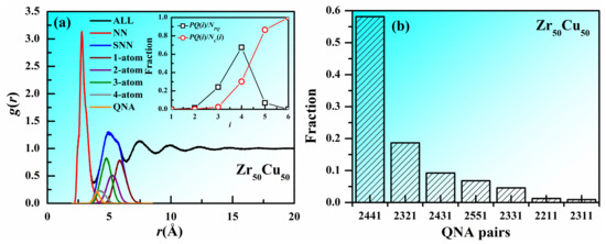 Correlation between QNA and cluster connection in Zr50Cu50 MG at 300 K. (a) pair distribution function g(r) for Zr50Cu50 MG at 300 K. The decomposed pair distribution function for the nearest neighbors (NN), second nearest neighbors (SNN) via one-atom, two-atom, three-atom, and four-atom cluster connections and QNAs, are also included. Insets are the fractions of PQ(i)/NPQ and PQ(i)/Nc(i) as a function of the number of shared atoms (i) in cluster connections. PQ(i) is the number of QNA pairs with i-atom cluster connection, NPQ is the number of all the QNA pairs and Nc(i) is the number of i-atom cluster connections. (b) Distribution of different types of QNA pairs.
