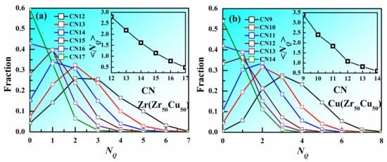 Voronoi tessellation method is one of the tools used most frequently to describe the local structure of metallic liquids and glasses. A plane is drawn to bisect each line connecting the center atom and one of the neighboring atoms, and the polyhedron enclosed by all the inner planes is called a Voronoi polyhedron (VP). The VP can be labeled by the Voronoi index <n3, n4, n5, n6>, where ni denotes the number of i-edged faces of the VP, to describe the arrangement and symmetry of the nearest-neighbor atoms around the center atom. The coordination number (CN) concept is employed to characterize the number of nearest neighbors which can be determined by Voronoi method (CN = ∑ni). If the CN of an atom is much larger than that of another atom with the same element type, the atomic packing around this atom might be thought to be much denser. Therefore, does larger CN corresponds to denser atomic packing? Figure 3a displays of NQ for the atoms with different CNs in Zr50Cu50 MG at 300 K at 300 K. The distribution of NQ for Zr atoms with CN = 12 in Zr50Cu50 has a peak at NQ 2~3. As CN increases, the peak moves to smaller NQ, indicating the atomic packing of atoms with larger CN tend to be denser. However, it should be noted that the distributions with different CN have overlapping, suggesting that the atomic packing of some atoms with larger CN might be loose. The distribution of NQ for Cu atoms with different CN shown in Figure 3b also displays the similar trend. Insets of Figure 3 show that, as CN increases, the average NQ decreases for both Zr and Cu atoms. These facts indicate that larger CN are helpful to reduce NQ, but not decisive.