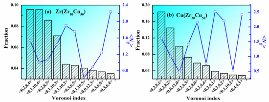 Besides the CN, do other structural features influence the atomic packing in MGs? In many MGs, some favored VPs are considered as the structural units to construct the atomic structure of the whole system. Figure 4a,b show the fraction and <NQ> of top 10 VPs around Zr and Cu in Zr50Cu50 MG at 300 K. Around Zr atoms, the <0,2,8,4> VP has the largest population but its <NQ> is not the lowest one, indicating that its atomic packing is not the densest. All the 10 top VPs can be classified into several groups according to their CNs. It can be seen that the VPs with CN = 16 (<0,1,10,5>) have the lowest <NQ>, the VPs with CN = 15 (<0,0,12,3>, <0,1,10,4>, <0,2,8,5> and <0,3,6,6>) have the second lowest <NQ>, the VPs with CN = 14 (<0,1,10,2>, <0,2,8,4> and <0,3,6,5>) have the third lowest <NQ> and the VPs with CN = 13 (<0,1,10,2> and <0,3,6,4>) have the largest <NQ>. These facts are consistent with the conclusion obtained by Figure 3, which is that larger coordination numbers correspond to lower <NQ>. For a certain CN, take CN = 15 for an example. The order is <NQ>(<0,0,12,3>) < <NQ>(<0,1,10,4>) < <NQ>(<0,2,8,5>) < <NQ>(<0,3,6,6>). Therefore, larger five-fold symmetry (n5) corresponds lower <NQ>. The situations for CN = 14 and CN = 13 are the same to that for CN = 15. Around Cu atoms, the <0,2,8,1> VP has the largest population but its <NQ> is not the lowest one, indicating that its atomic packing is not the densest. The main CNs around Cu atoms are 10, 11, 12, and 13. Different from Zr atoms, although the <0,1,10,2> and <0,3,6,4> VPs has the largest CN (13), they do not have the lowest <NQ>. The <0,0,12,0> VP, well known as icosahedral polyhedron, has the lowest <NQ>, indicating that its atomic packing is rather dense, which might be the reason why icosahedral clusters play an important role in the stability of liquid structure. For a certain CN, the conclusion that larger five-fold symmetry corresponds lower <NQ> also holds around Cu. For example, For CN = 12, <NQ> (<0,0,12,0>) < <NQ>(<0,2,8,2>) < <NQ>(<0,3,6,3>) < <NQ>(<0,4,4,4>). Therefore, besides coordination number, five-fold symmetry also plays an important role in the atomic packing in MGs.