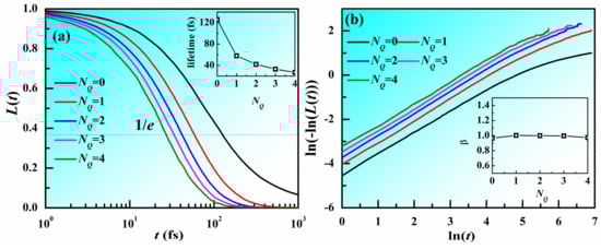 Lifetime for atoms with different NQ in Zr50Cu50 MG at 300 K. (a) Lifetime function (L(t)) for different NQ as a function of time t. Inset is the lifetime of different NQ. (b) ln(−ln(L(t))) vs. ln(t), inset is the slope with ln(t) within [0, 3] as a function of NQ.