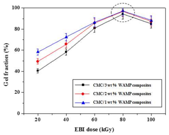 Effect of EBI dose on gel fraction of CMC/WAMP composites.