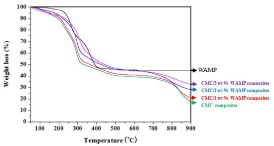 The thermal behavior for WAMP, CMC composite, and CMC/WAMP composites in terms of the weight changes in samples versus heating temperature is presented in Figure 2. WAMP represented a steep thermal decomposition behavior in the range of around 200–400 °C and a near-constant residue of around 45% from 400 to 900 °C. The CMC composite was found to lose weight due to water evaporation below 200 °C and thermal decomposition above 200 °C; thus, the residue at 900 °C was 17.4%. The thermal behavior of the CMC/WAMP composites was similar to that of the CMC composite. However, we could observe that the increase in the WAMP content increased the thermal stability and the residue amount observed at 900°. These results indicated that a stable and large residue (45.1%) of the WAMP component in the composites at temperature above 400–900 °C influenced the final residue of the CMC/WAMP composites.