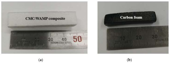 Carboxymethyl cellulose (CMC) as precursor of carbon foam is an eco-friendly material and a representative cellulose derivative. It is a white, non-toxic, water-soluble, light-weight, and thermally stable powder and has been used in the food, agricultural, pharmaceutical, and medicine industries [16,17].