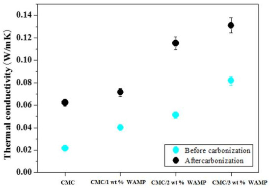 Figure 4 shows the thermal conductivity of the CMC composite, the CMC/WAMP composites, and their carbon foams. Generally, the density, porosity, and fillers of the foam materials influence the thermal conductivity, and the presence of carbonized materials increase the thermal conductivity. The thermal conductivities of carbon foams were higher than those of the composites. In addition, thermal conductivities of the CMC/WAMP composites increased with increasing WAMP content, and the same trend was observed in their corresponding carbon foams. As mentioned in Table 1, WAMP contained aluminum, which contributed to the thermal conductivity of the CMC/WAMP carbon foams.