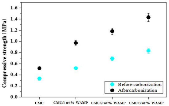 Figure 5 represents the Compressive strength of the CMC composite, CMC/WAMP composites, and their carbon foams. As shown in Figure 5, the compressive strength of the composites was below 1 MPa but the increase in the WAMP content increased the compressive strength. In addition, the compressive strength of the carbon foams was about two times greater than those of their corresponding composites. Usually, compressive strength can be improved by the addition of fillers to endure the compressive load. Therefore, the compressive strength increased with increasing WAMP content. However, compared to carbon foams (over 2 MPa) prepared by fossil fuel precursor with several filler, the compressive strength values of CMC/WAMP carbon foam were very low [24,25,26].